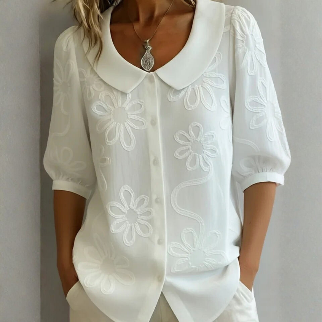 Esta camisa combina un estilo clásico con una apariencia femenina y elegante. Las delicadas flores bordadas aportan un aspecto vintage romántico, mientras que el cuello alto añade un toque refinado y estiloso. Ligera y agradable de llevar, es adecuada tanto para el día a día como para ocasiones más elegantes. Ya sea combinada con jeans para un look casual o con falda y botas para un estilo clásico, esta camisa se adapta sin esfuerzo a cualquier ocasión.