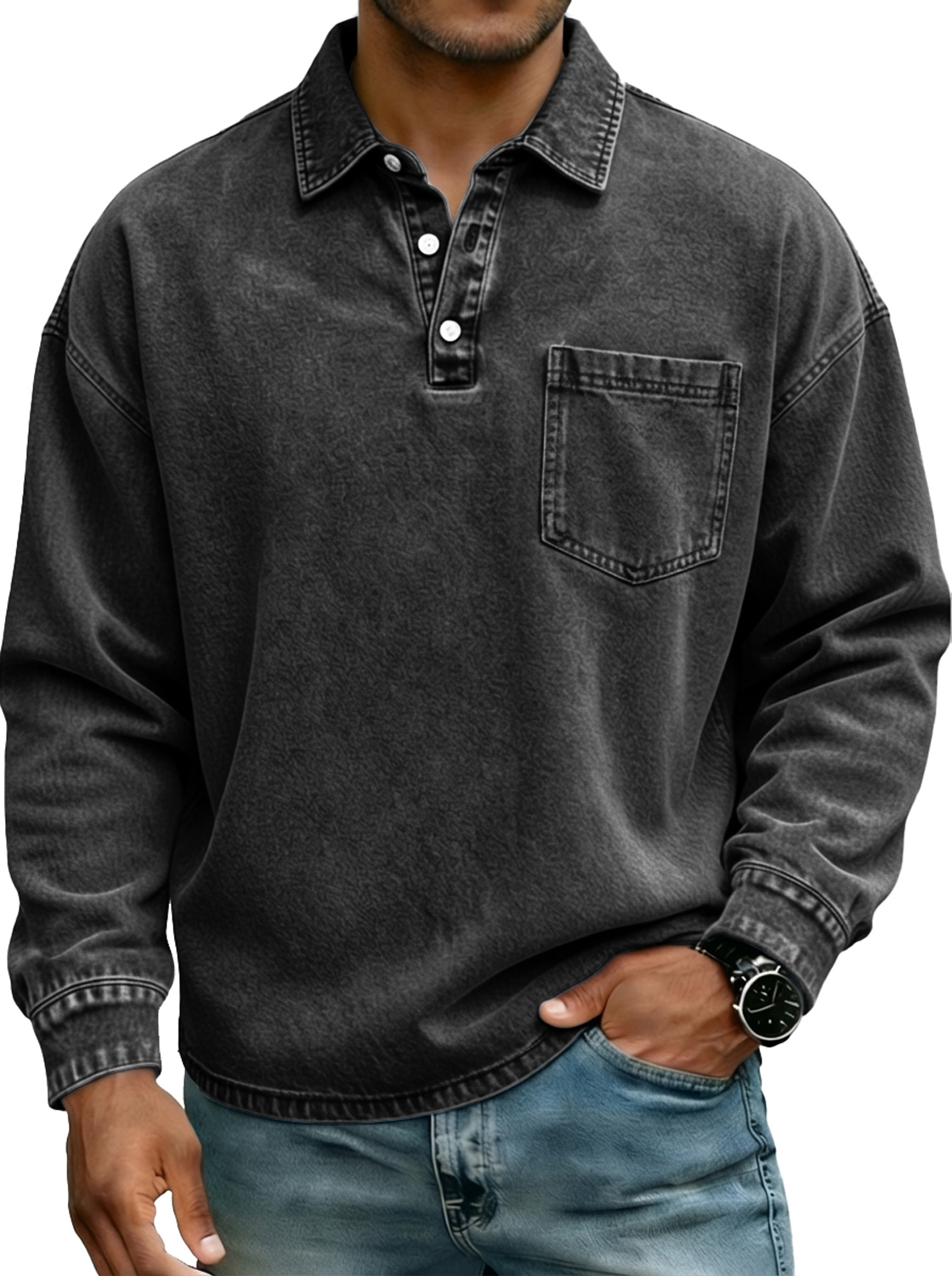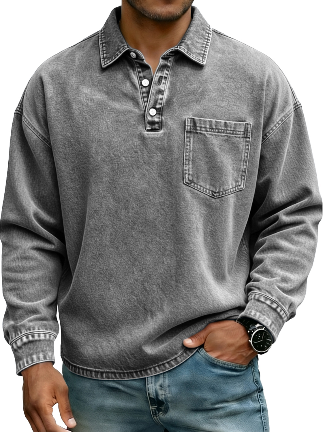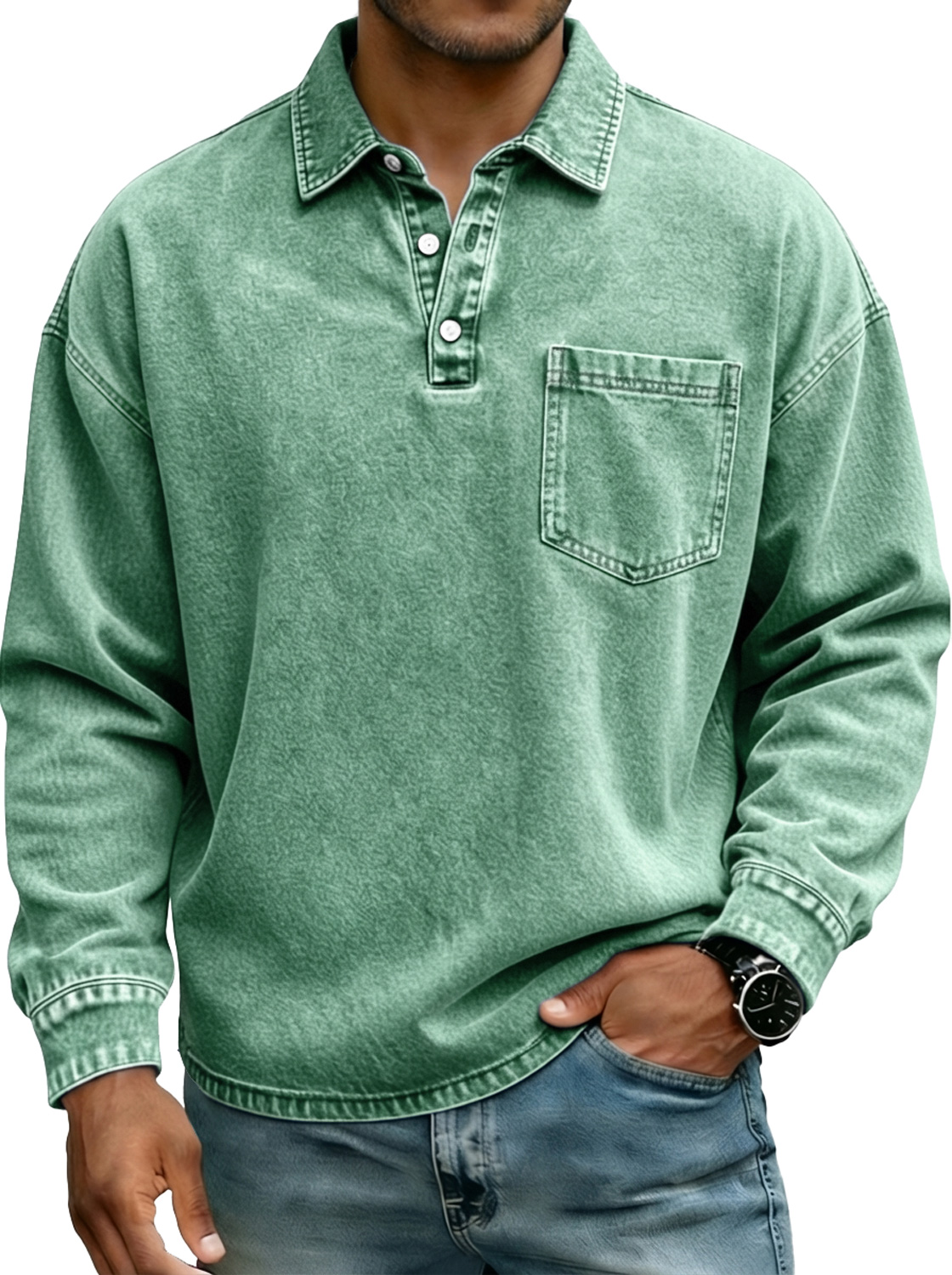 Camisa polo de manga larga para hombre estilo vintage con botones en el cuello y bolsillo.
