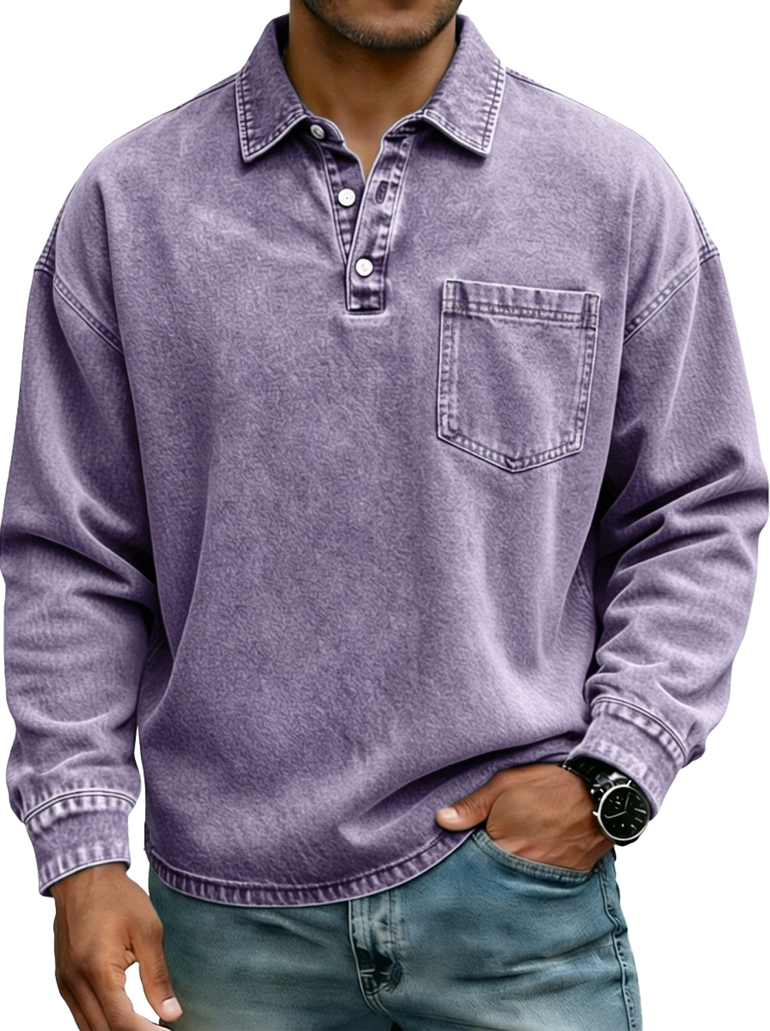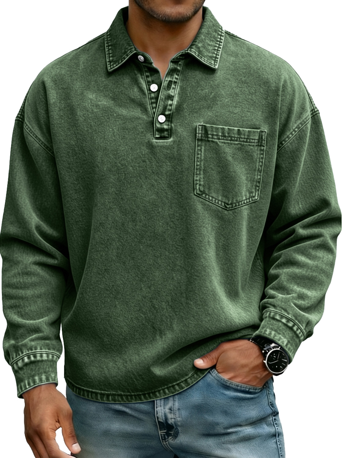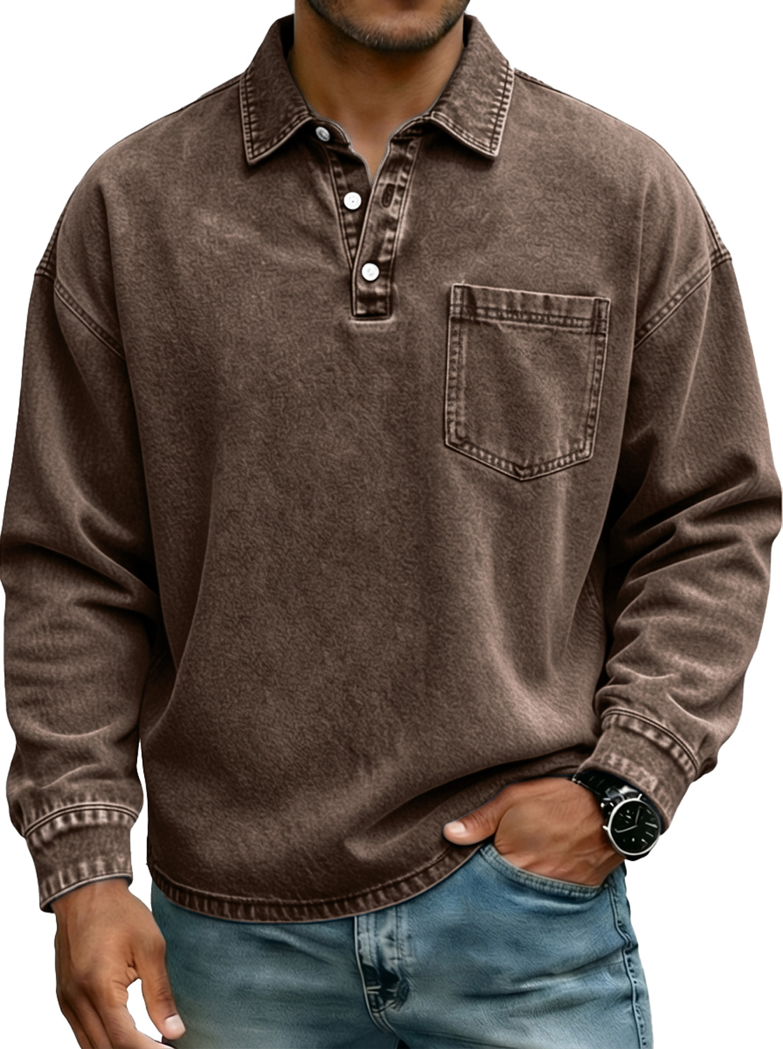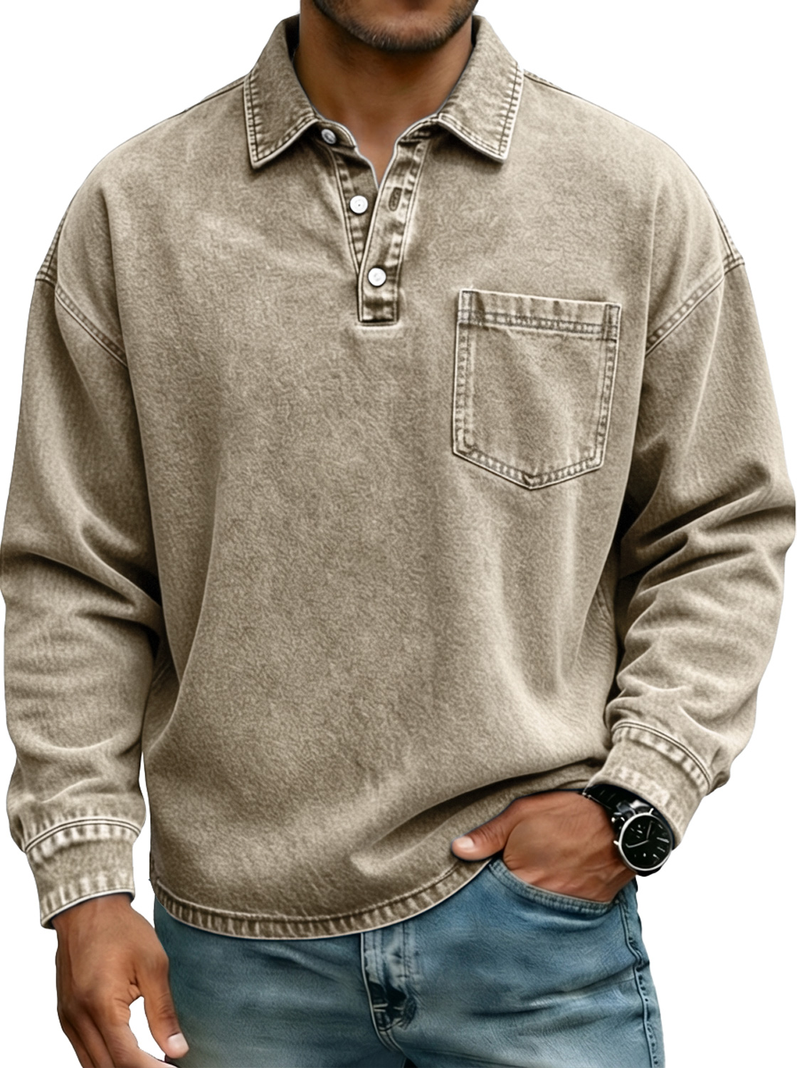 Camisa polo de manga larga para hombre estilo vintage con botones en el cuello y bolsillo.
